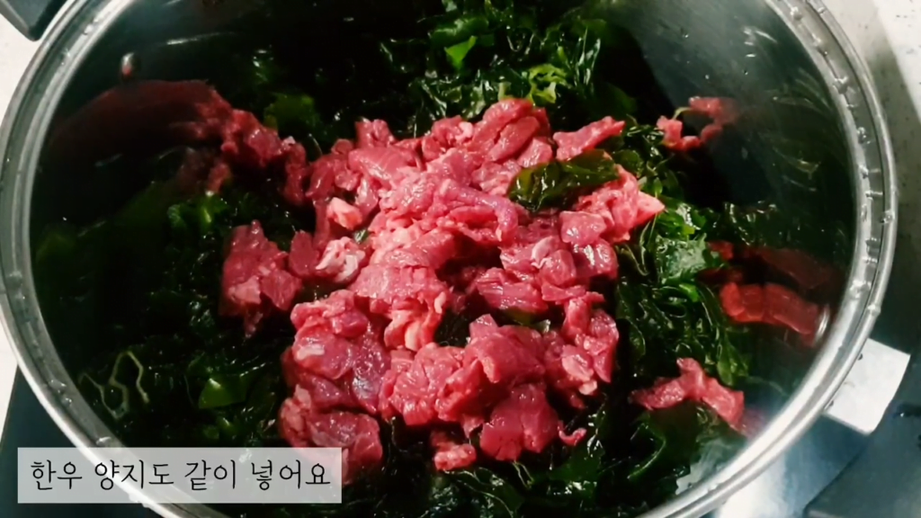 냄비에는 미역을 볶지 않고, 미역과 한우 양지를 함께 넣어줍니다.