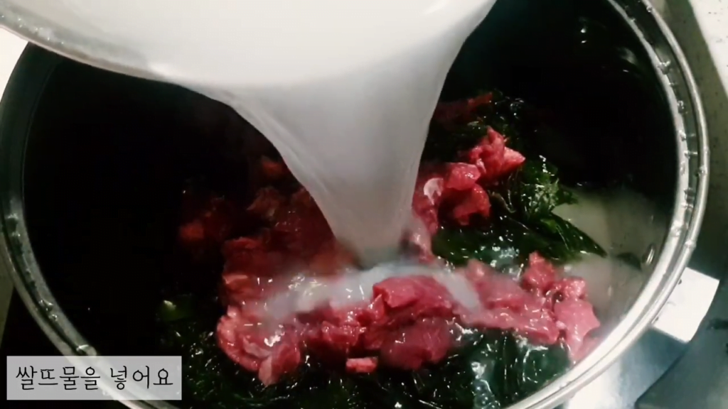 쌀은 물에 씻은 후 첫 번째로 나온 물은 버리고, 그 다음으로 나온 물을 미역국 육수로 사용합니다.