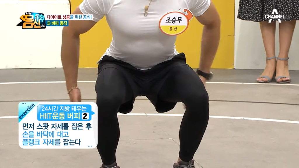 먼저 스쿼트 자세를 잡은 후, 손을 바닥에 대고 플랭크 자세를 취합니다.