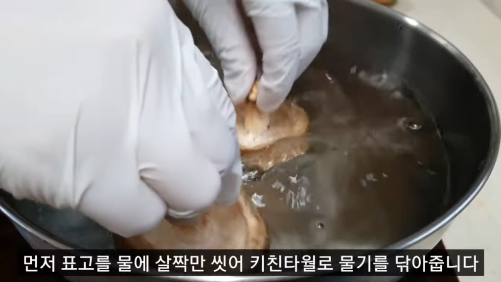 먼저 표고버섯을 물에 약간 씻어주고, 키친타월로 물기를 닦아줍니다.