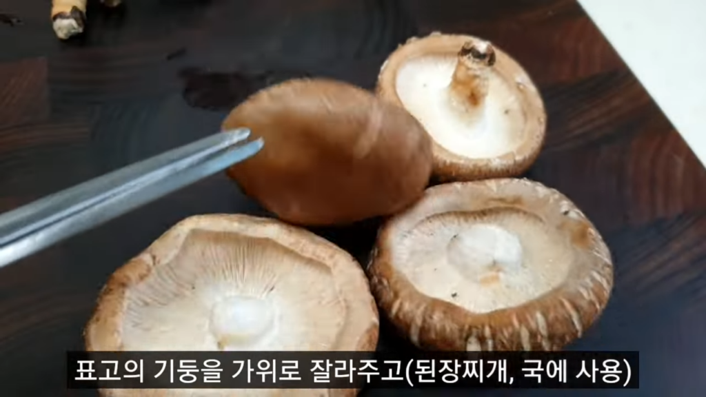 표고버섯의 줄기를 가위로 잘라주고(된장찌개, 국에 사용), 가늘게 채썰어줍니다.