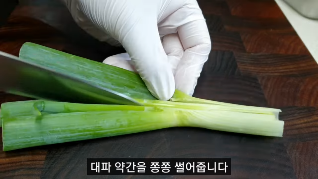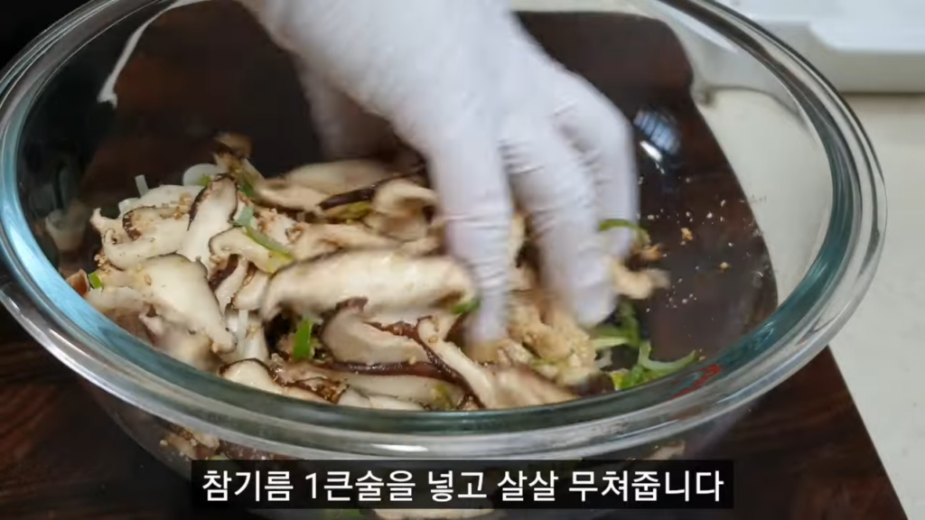 볼에 물에 불린 표고버섯과 대파를 넣고, 까나리액젓 1큰술, 매실액 1큰술, 다진 마늘 1/2큰술, 매실액 1/2큰술, 참기름 1큰술을 넣어 잘 섞어줍니다.