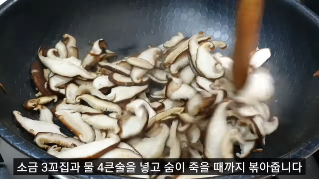 예열된 팬에 기름을 바르지 않고 표고버섯을 넣고, 소금 3 꼬집과 물 4큰술을 추가해 숨이 죽을 때까지 볶아줍니다.