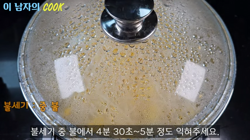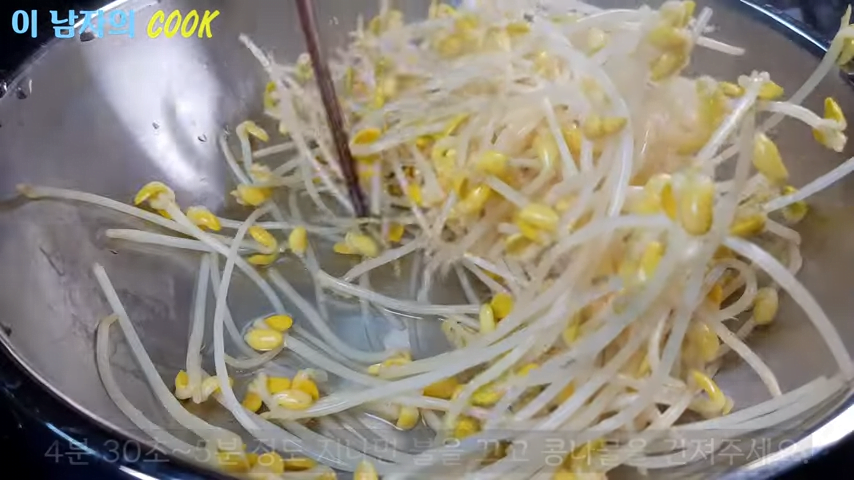 냄비에 콩나물을 넣고 물 100ml를 부은 뒤, 뚜껑을 덮고 중불에서 4분 30초에서 5분 정도 익힙니다.