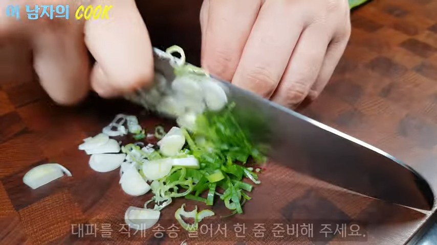 콩나물이 익는 동안 마늘 한 쪽을 작게 다져 준비합니다. 또한 대파도 송송 썰어 한 줌 정도 준비해 둡니다.