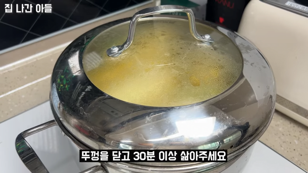 물이 팔팔 끓기 시작하면 불을 중불로 줄이고, 뚜껑을 닫은 상태로 약 30분간 옥수수를 쪄줍니다.