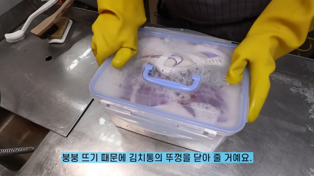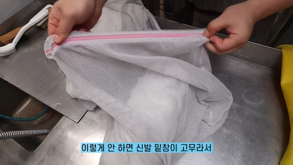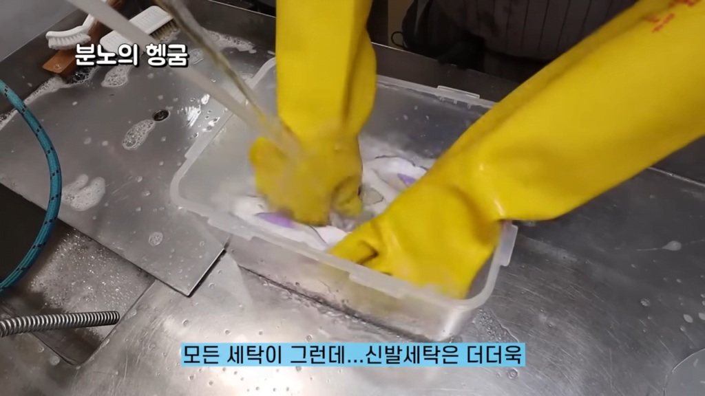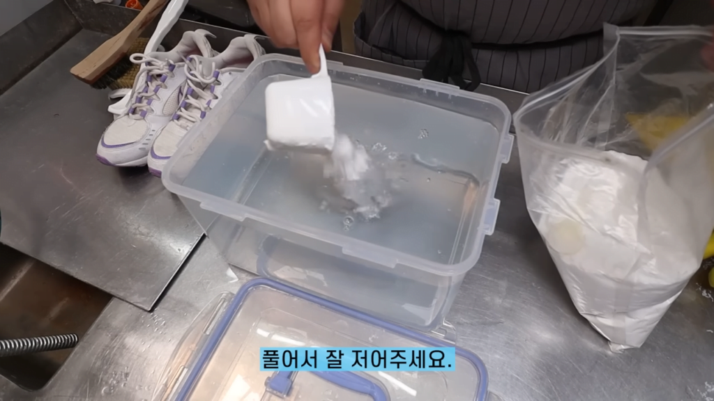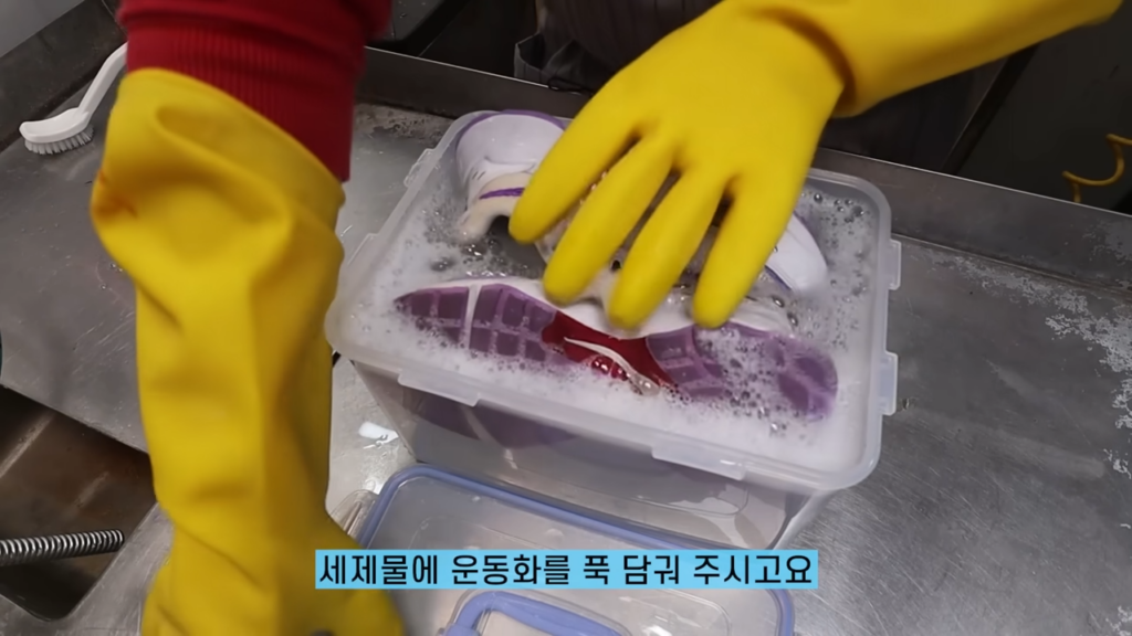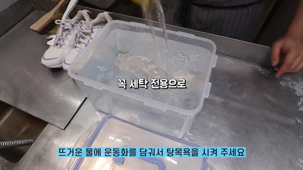 비닐봉지를 이용하여 운동화를 담가두는 것이 일반적이지만, 김치통을 사용해 보면 더 편하다는 느낌을 느낄 수 있습니다.