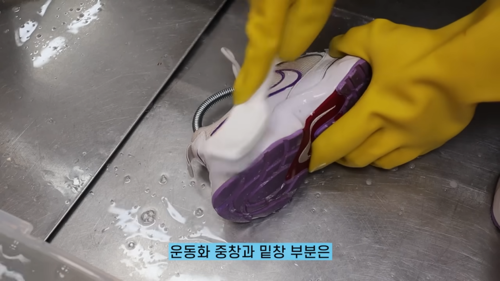 운동화의 중창과 밑창 부분은 강한 솔을 이용하여 닦아주세요.