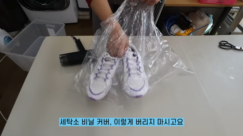 세탁소 비닐 커버를 재활용하여 신발을 드라이기로 말릴 수 있는데요.