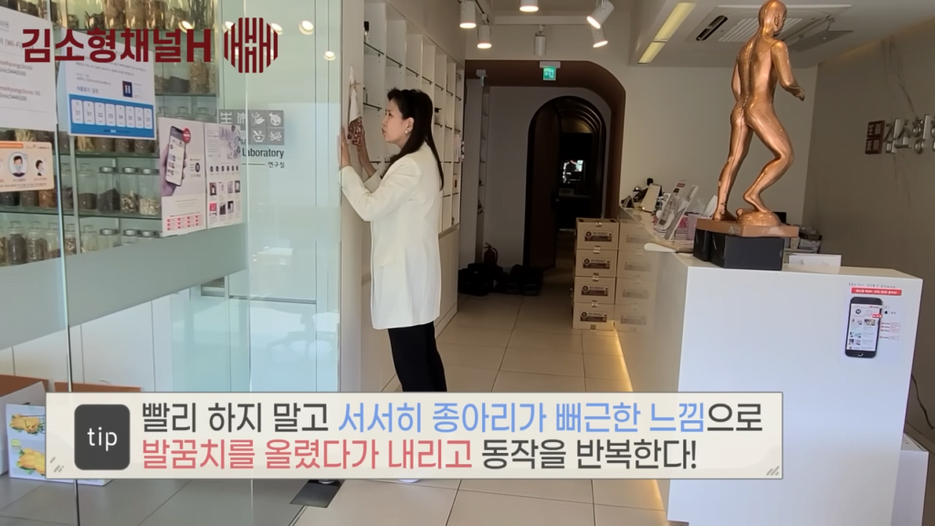 양쪽 발을 어깨 넓이로 벌리고 벽에 손을 대고 발꿈치를 화상처럼 올리고 내리는 동작을 반복합니다.