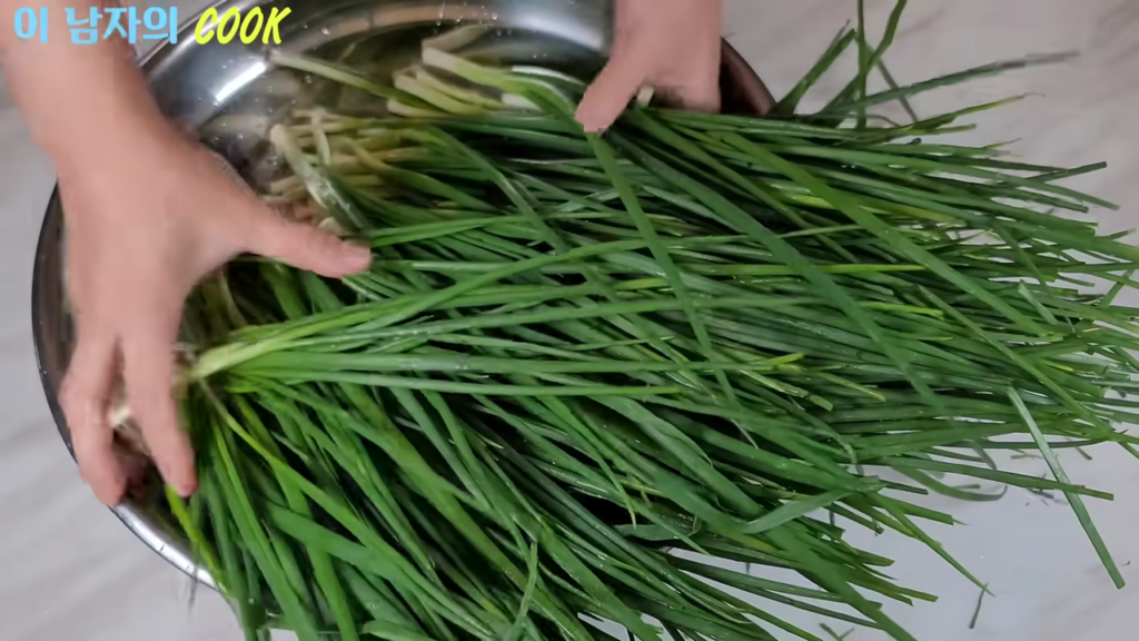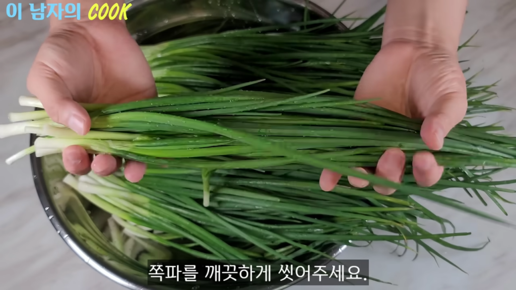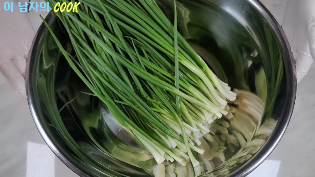 한번에 넣을 대야가 없다면, 쪽파를 나눠서 넣어주세요.