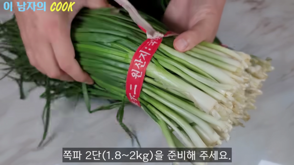 쪽파를 2단 준비해 주세요. 약 1.8 kg, 즉 2kg 정도입니다. 가능하다면, 손질이 어느 정도 된 쪽파를 구매하는 것이 좋습니다.
