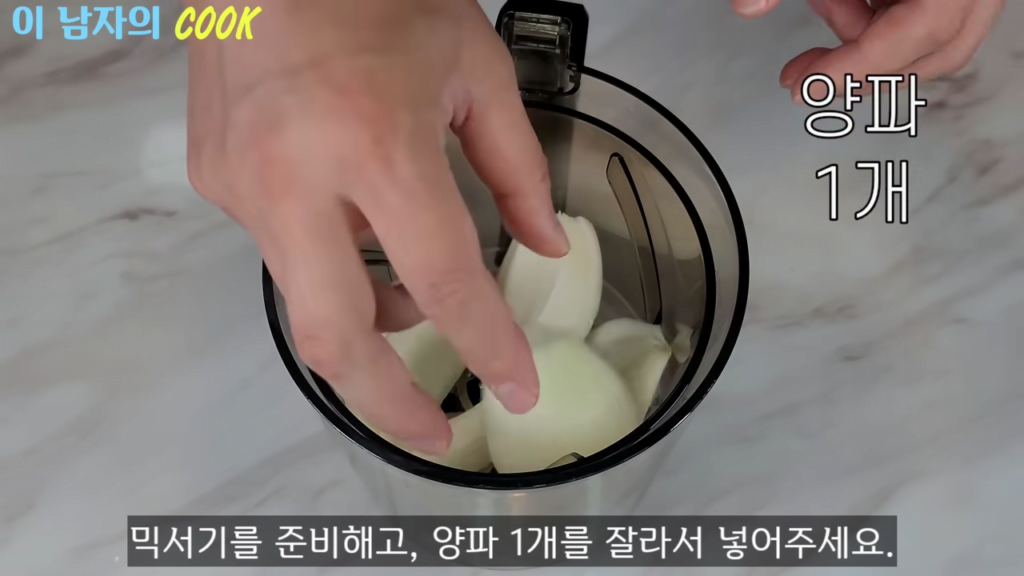 믹서기를 준비한 후, 양파 1개의 껍질을 벗기세요. 양파가 잘 갈리도록 여러 등분으로 잘라서 믹서기에 넣어주세요.