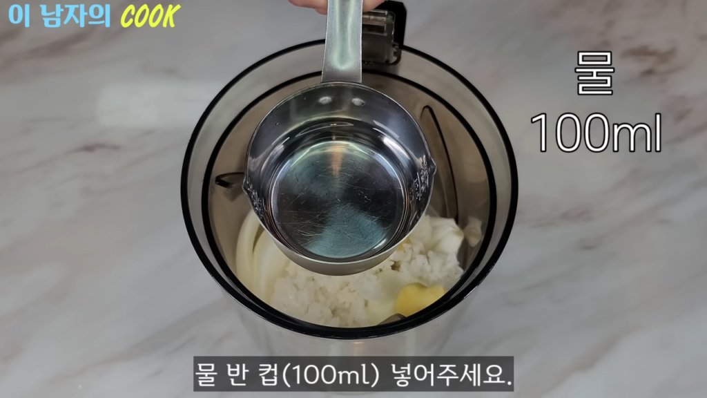 믹서기가 잘 돌아갈 수 있도록 물 100ml를 넣어주시고, 매실액 반컵을 넣어주세요.