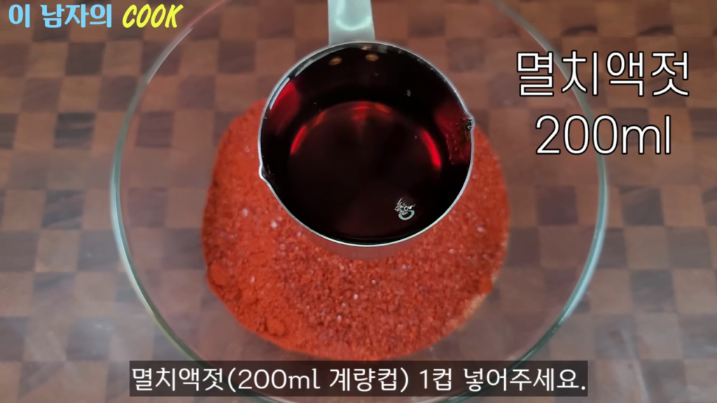 여기에는 멸치 액젓을 200ml 넣어 주시면 돼요. 물론, 까나리 액젓을 사용해도 괜찮습니다.