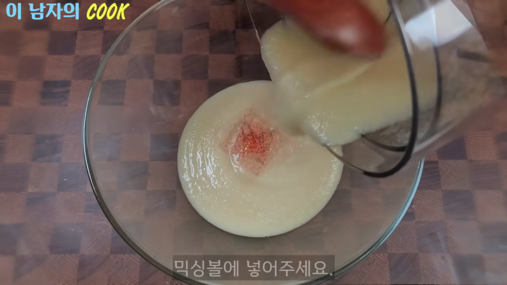 믹서기로 잘 간 후에는 믹싱볼에 담아 주세요. 그리고 나서, 200ml의 고추가루를 계량컵에 담아 주세요.