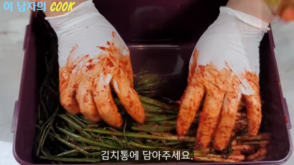 같은 방법으로 남아있는 쪽파도 모두 버무려서 김치통에 담아주세요.