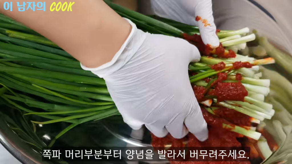 미리 만들어 놓았던 양념을 쪽파의 머리쪽에 먼저 바르세요. 머리부터 양념을 골고루 바른 후, 파의 파란 부분에도 남은 양념을 골고루 발라주세요.
