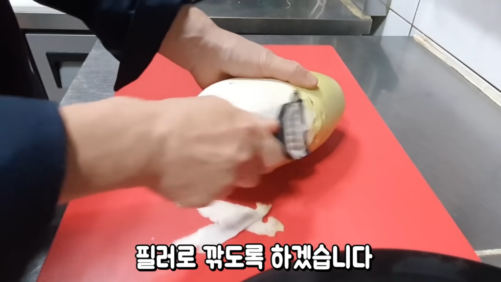 무의 양끝 부분을 잘라내고, 필러로 무 껍질을 깎습니다.