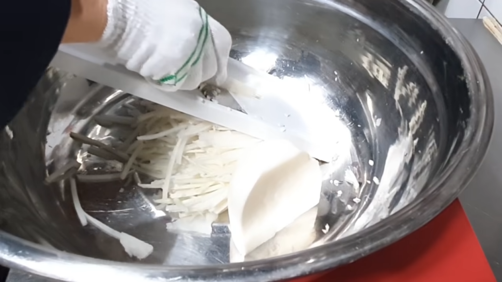 껍질을 깎은 무를 반으로 자른 후, 장갑을 착용하고, 강판에 무를 채썰어줍니다.