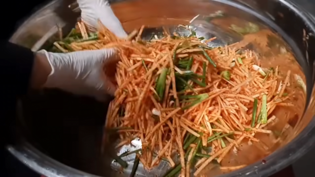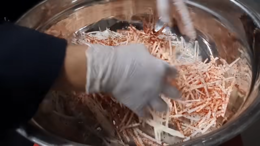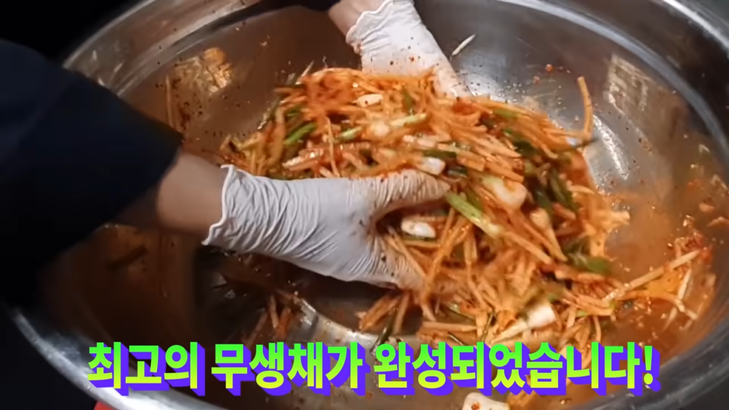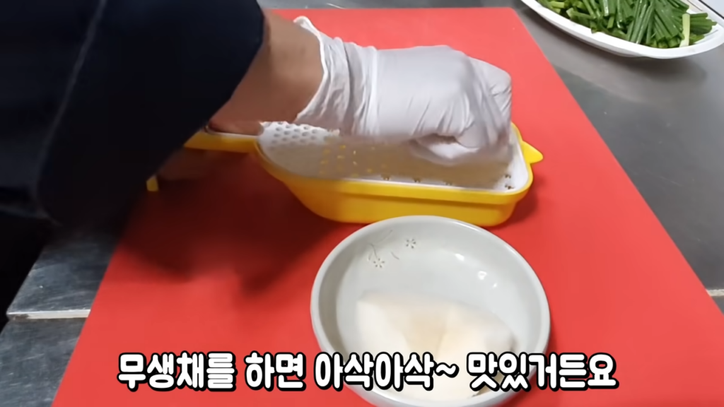 이때 배는 강판에 갈아야 무생채의 식감이 아삭아삭해집니다.