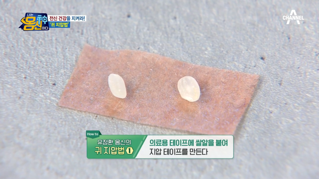 지압 테이프를 만들기 위해 의료용 테이프에 쌀알을 붙입니다.