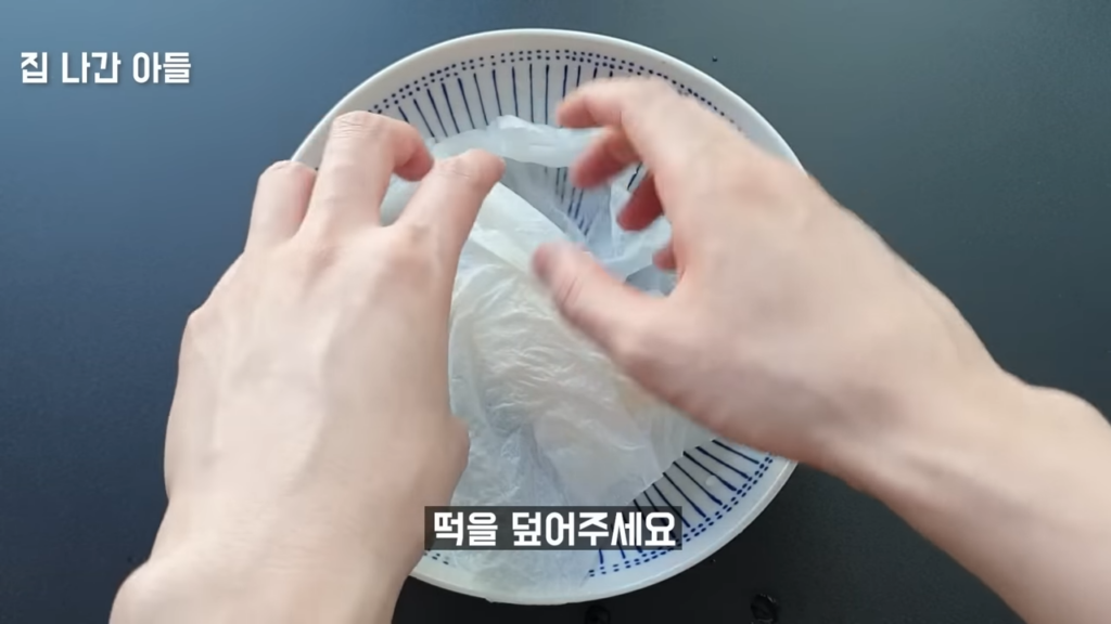 그 다음으로, 이불처럼 떡에 키친타올을 꼼꼼하게 덮어주는데, 떡의 수분이 날아가는 것을 방지하기 위함입니다.