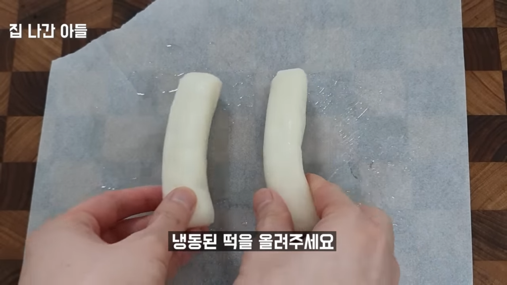 그 다음, 단단하게 냉동된 떡을 호일 위에 올립니다.