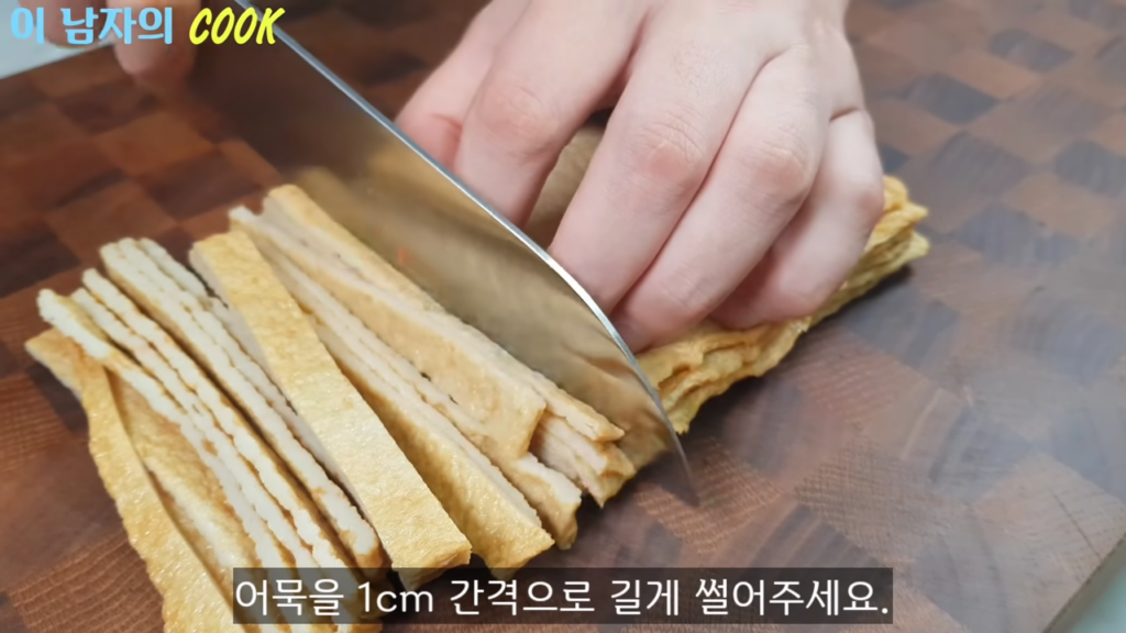 준비한 어묵은 약 1cm 간격으로 가로로 길게 잘라주세요.