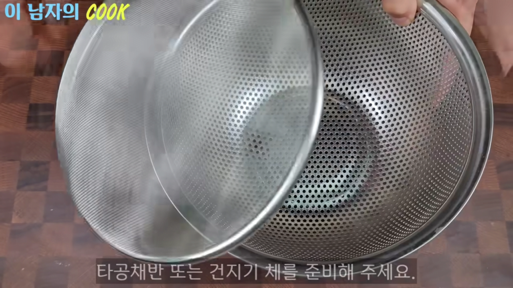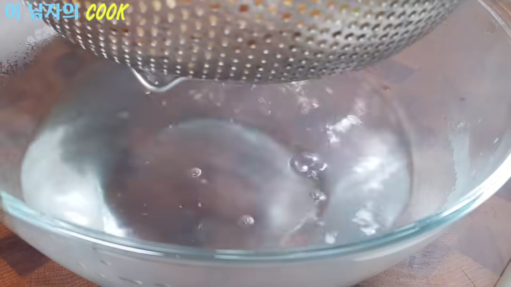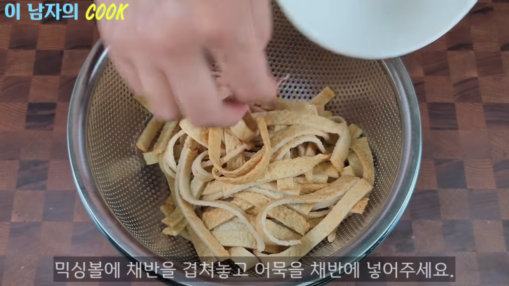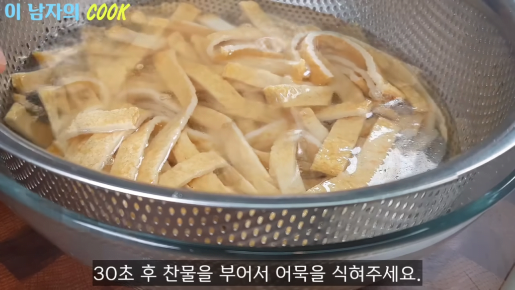 30초가 지나면 어묵을 채반에서 꺼내 물기를 제거하고, 찬물로 씻어주세요.