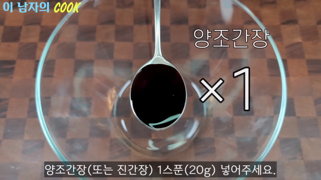 양념을 만들기 위해, 먼저 양조간장 한 스푼을 추가합니다.