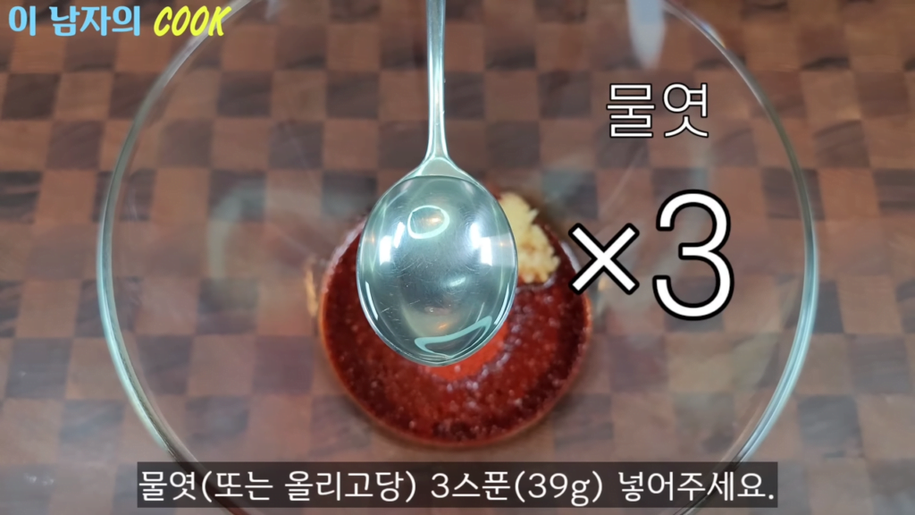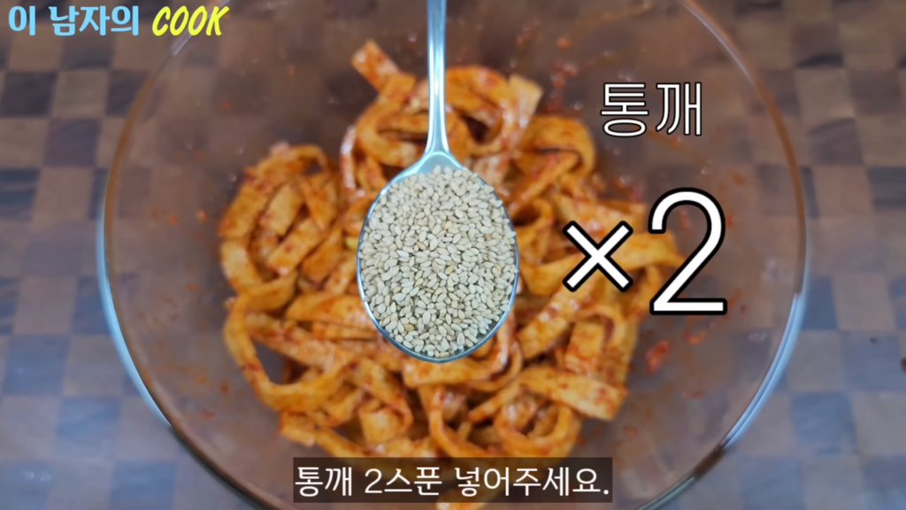 무침요리니까, 올리고당을 세 스푼 넣는 것도 좋은 방법입니다. 단맛을 싫어하시는 분은 두 스푼만 넣어도 괜찮습니다.