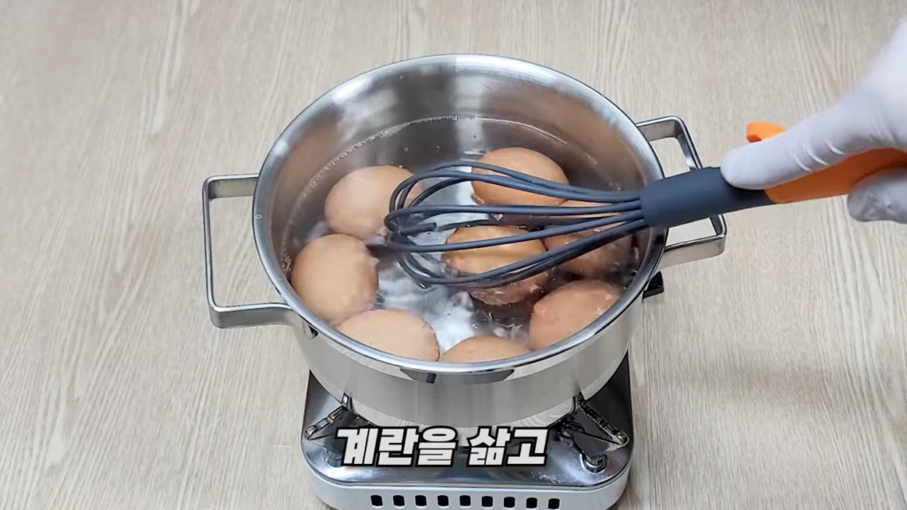 두 번째, 계란을 삶고 거품기를 이용해 밀폐용기에 넣어주세요.