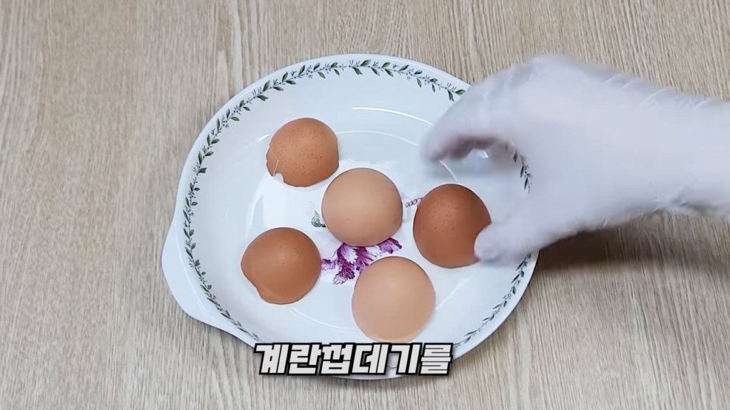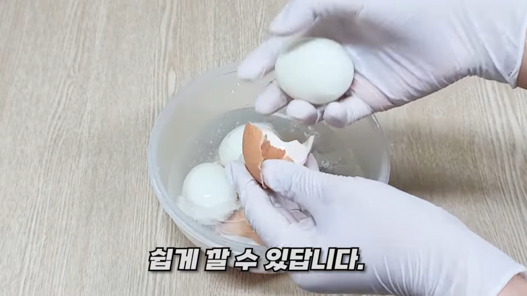 그리고 찬물을 넣고 흔들면 계란 껍질을 쉽게 깔 수 있습니다.