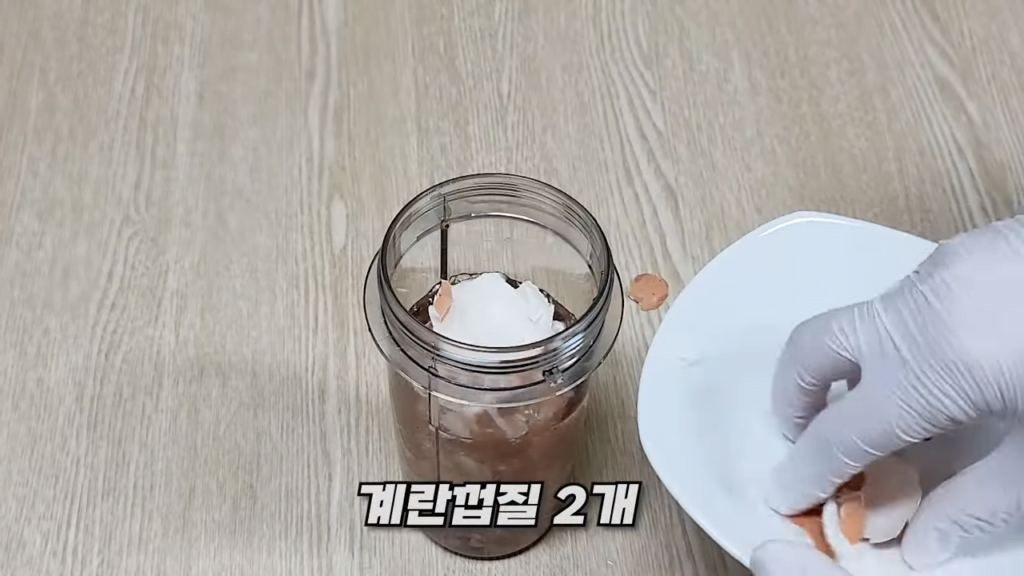 믹서기에 물 반 정도와 계란 껍질 두 개, 그리고 조금의 식초를 넣고 1분 동안 돌려주세요.