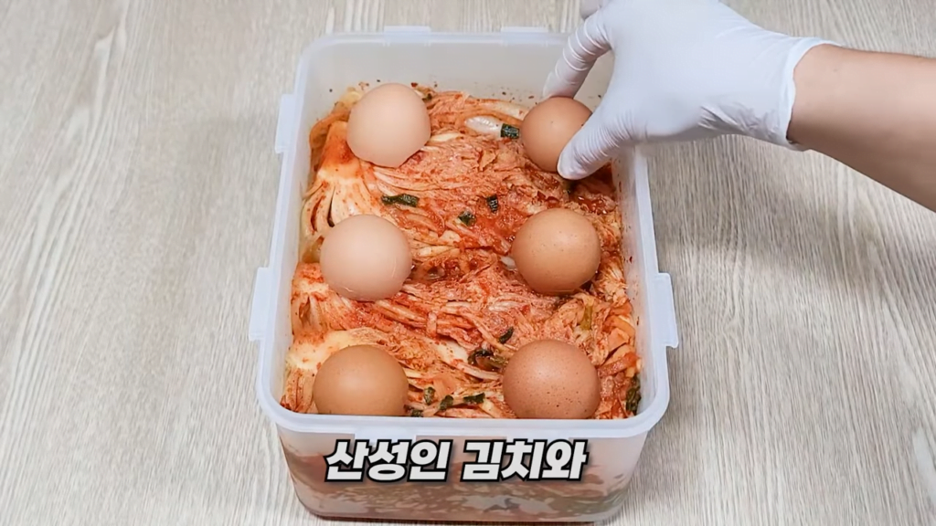 이렇게 하면, 산성인 김치와 염기성 성질인 계란 껍질이 만나 김치가 쉽게 상하는 것을 늦출 수 있습니다.