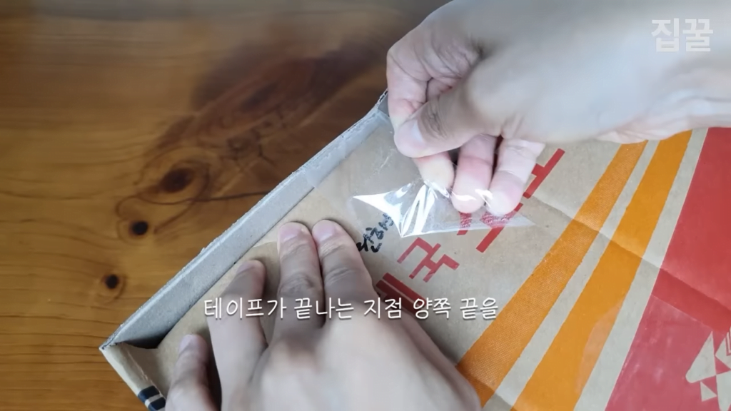 테이프가 끝나는 지점 양쪽 끝을 손으로 꾹 누르고, 양쪽을 길게 잡아당기면 테이프가 상자에서 분리되어 깨끗하게 제거됩니다.
