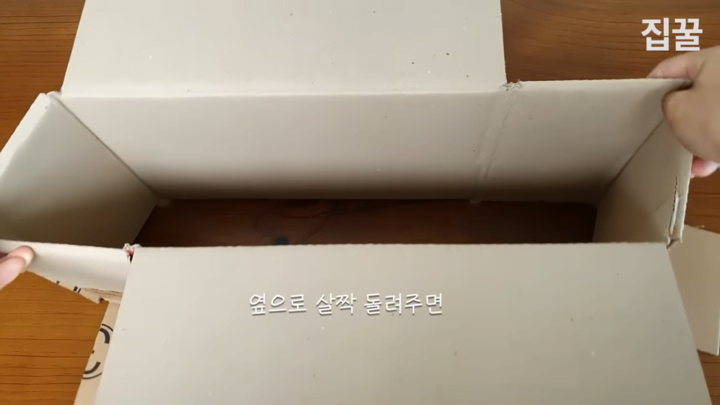 상자의 위아래 덮개에 표시를 한 후 칼과 가위로 잘라주시고, 양쪽 길이를 맞춰 접은 후 옆으로 살짝 돌려주면 새로운 택배 상자를 만들 수 있습니다.