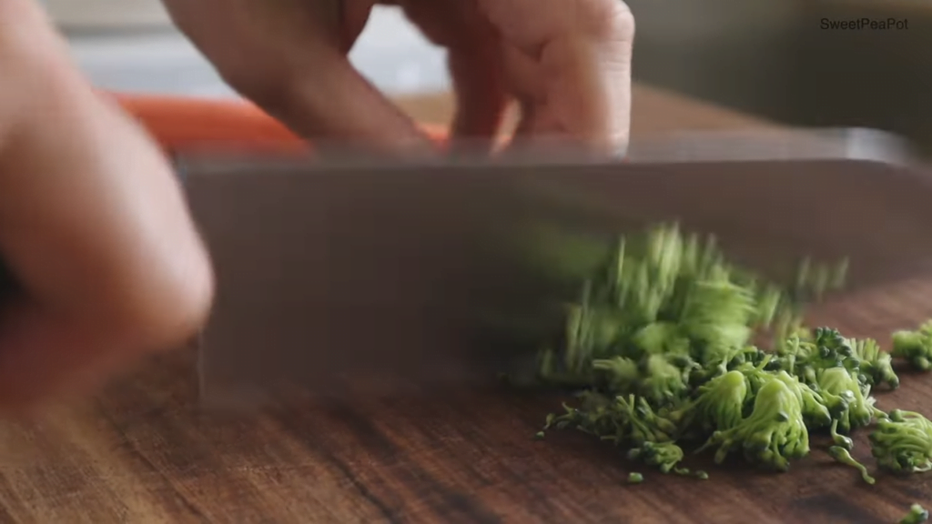 브로콜리를 잘게 자르고, 당근도 한 줌 잘게 자른 후 잠시 두세요.