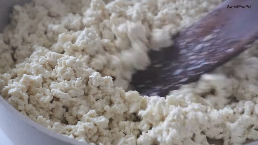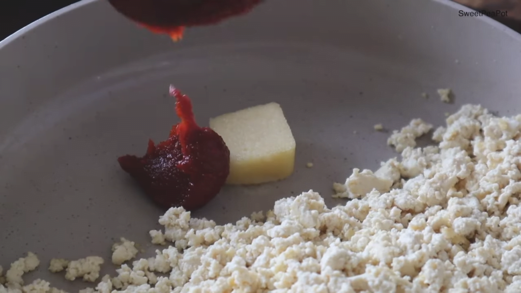 두부가 볶아진 상태라면 한쪽에 자리를 만들고, 다진 마늘, 고추장(매운 것을 싫어하면 생략 가능), 세 스푼의 간장, 한 스푼의 아가베 시럽을 넣어 양념을 섞은 후 두부와 골고루 섞어주세요.