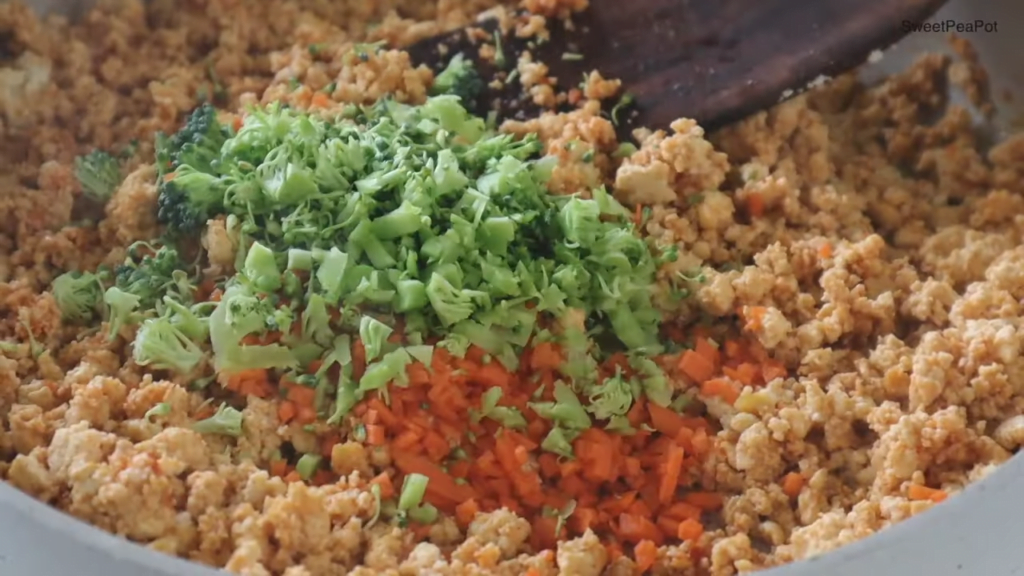 두부에 간이 배었으면 브로콜리와 당근을 넣고 약간 볶아주세요.