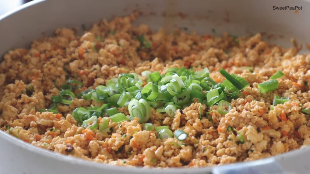 불을 끈 후, 잘게 자른 파, 참기름, 후추를 넣고 약간 볶아 마무리하세요.