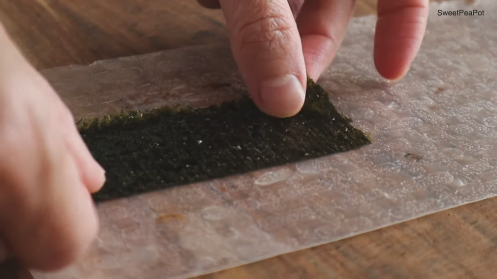 라이스 페이퍼를 물에 적신 후 김 한 장을 올리세요.