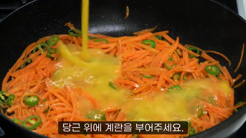불을 끄고 팬에 당근을 골고루 펼친 후에, 계란을 부어주세요.
