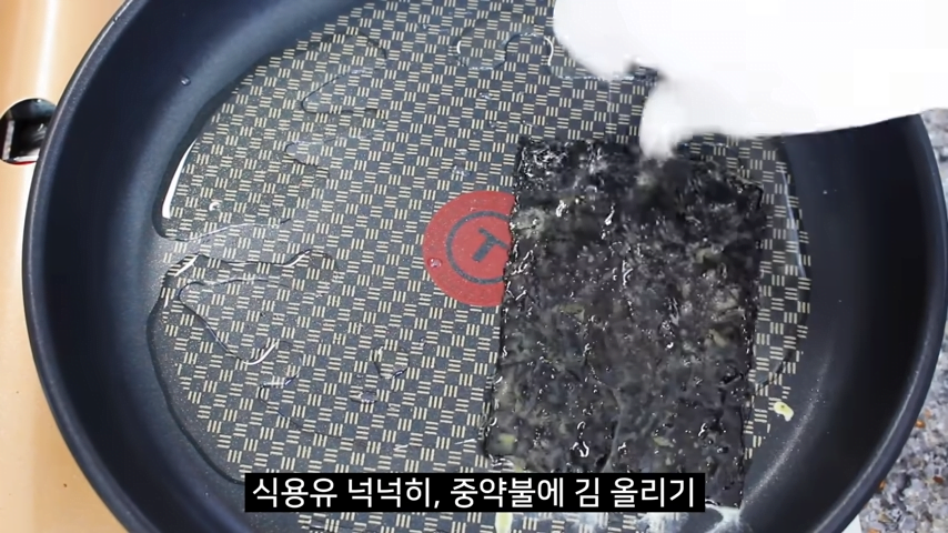 이제 후라이팬을 준비해서 식용유를 넉넉히 두르고, 중약불에 김을 올려줍니다.
