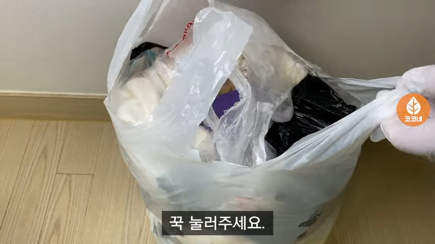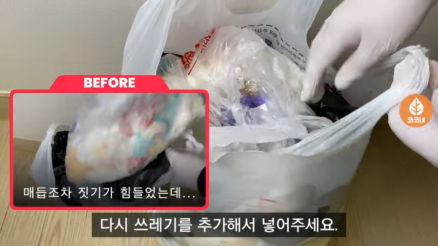 그런 다음 쓰레기를 계속 채워보세요. 기존에 있던 쓰레기를 손으로 꽉 눌러 주세요.