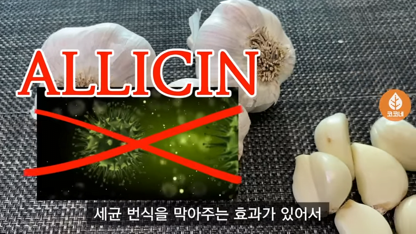 마늘에 들어있는 알리신이라는 성분이 세균 번식을 막아주는 효과가 있어서, 눈에 보이지 않는 세균도 예방할 수 있습니다.