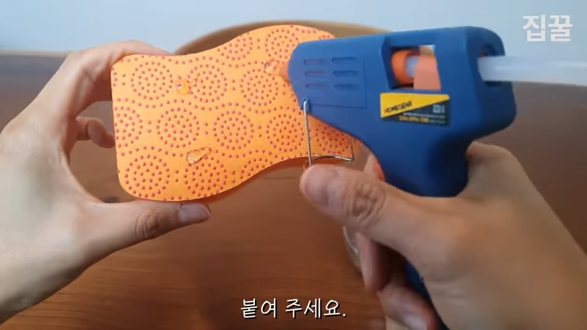 그 다음, 수세미를 글루건으로 붙이고, 잘라낸 페트병 윗부분에도 글루건을 바르고 끼워줍니다.