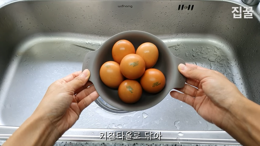 깨끗이 씻은 달걀 껍데기를 넣어주세요.