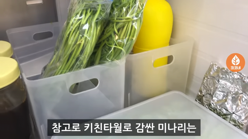 그리고 키친타월로 감싼 미나리는 세워서 보관하는 것을 잊지 마세요.